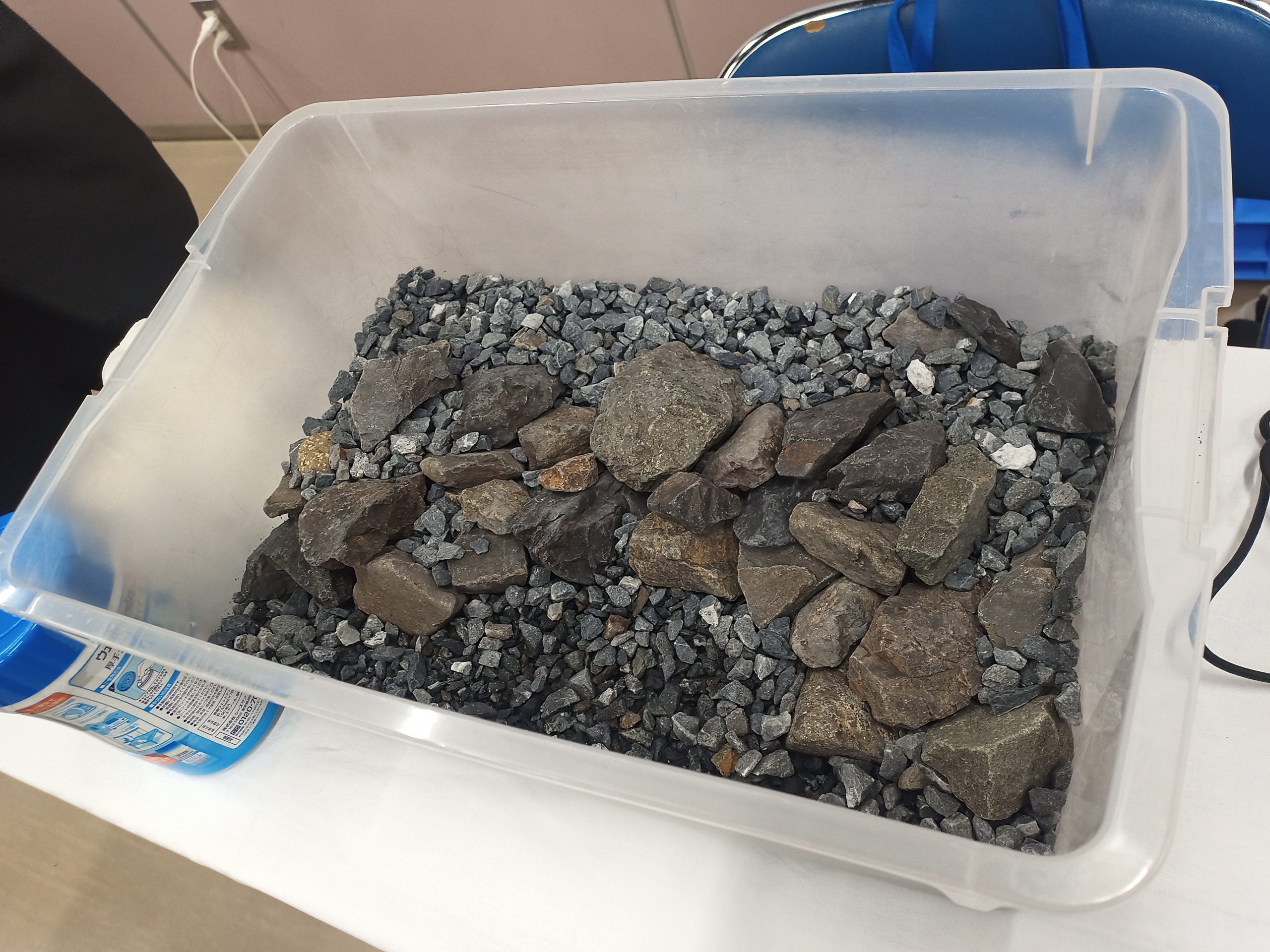 Hコンサルの展示では、石組み体験のコーナーもありました。コンクリートで固めない自然石の空石積みでも、石の形を見極め力を分散させるように積むことで、安定して維持できるそうです。