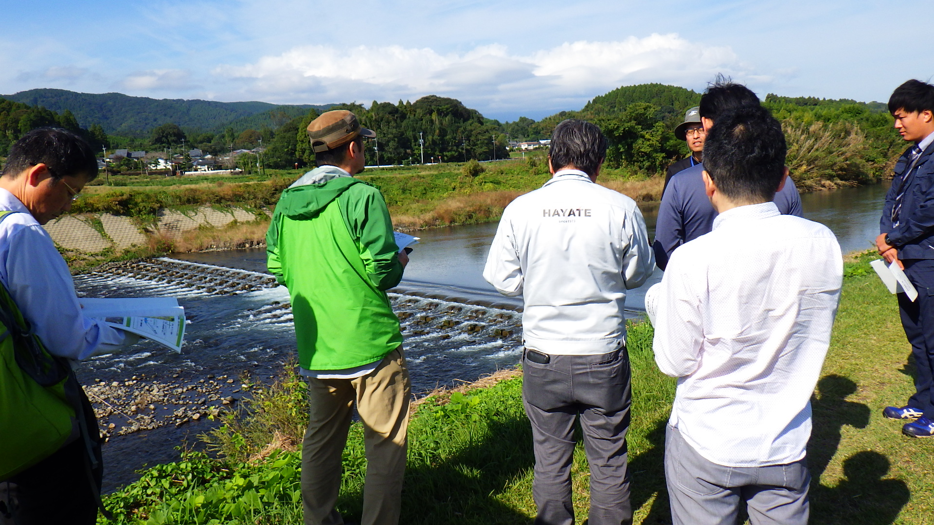 現地視察では、宮崎県内水面漁連、宮崎県河川課及び各事務所、NPO法人大淀川流域ネットワークにおける取り組みについて、各担当者から話を伺うと共に、実際の施工現場を見学し説明を受けました。