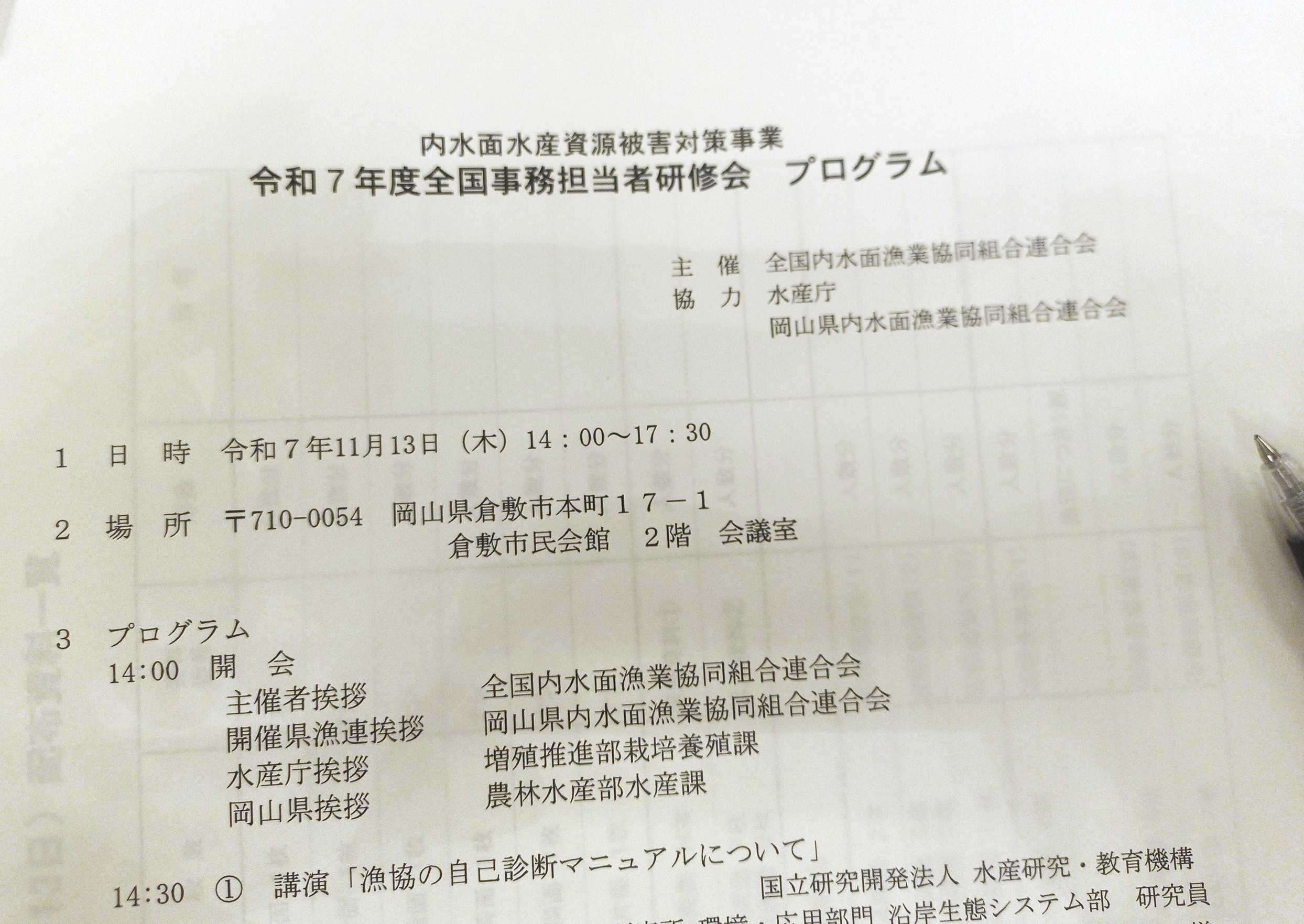 11月13日に全国内水面漁業協同組合連合会の事務担当者研修会が岡山県倉敷市で開催されました。
