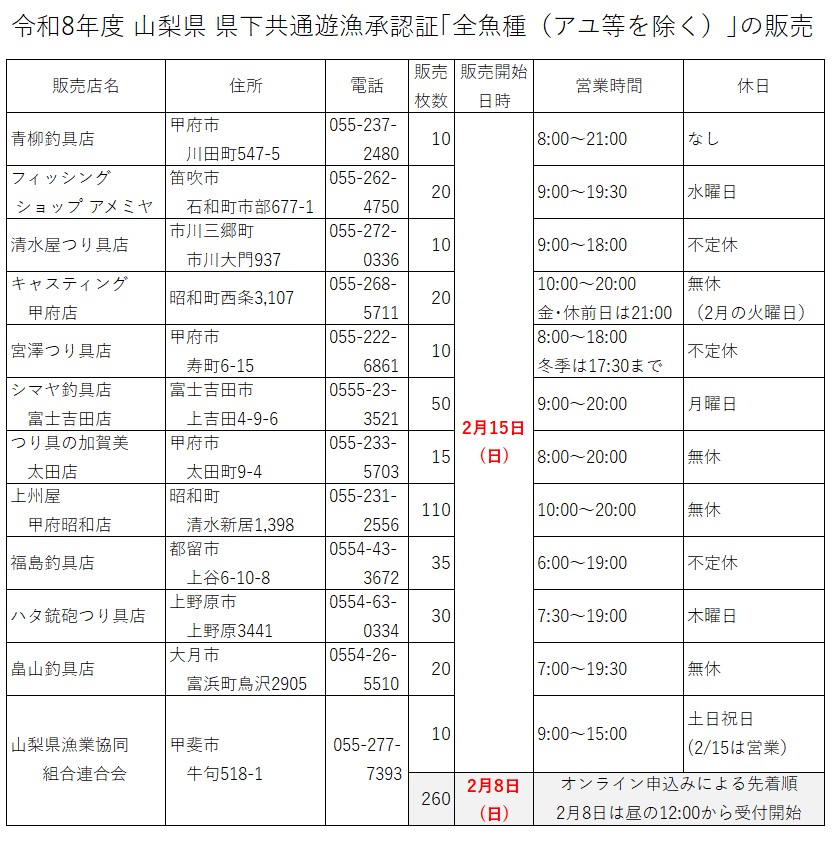 令和8年度 県下共通遊漁承認証「全魚種(鮎等を除く)」の販売