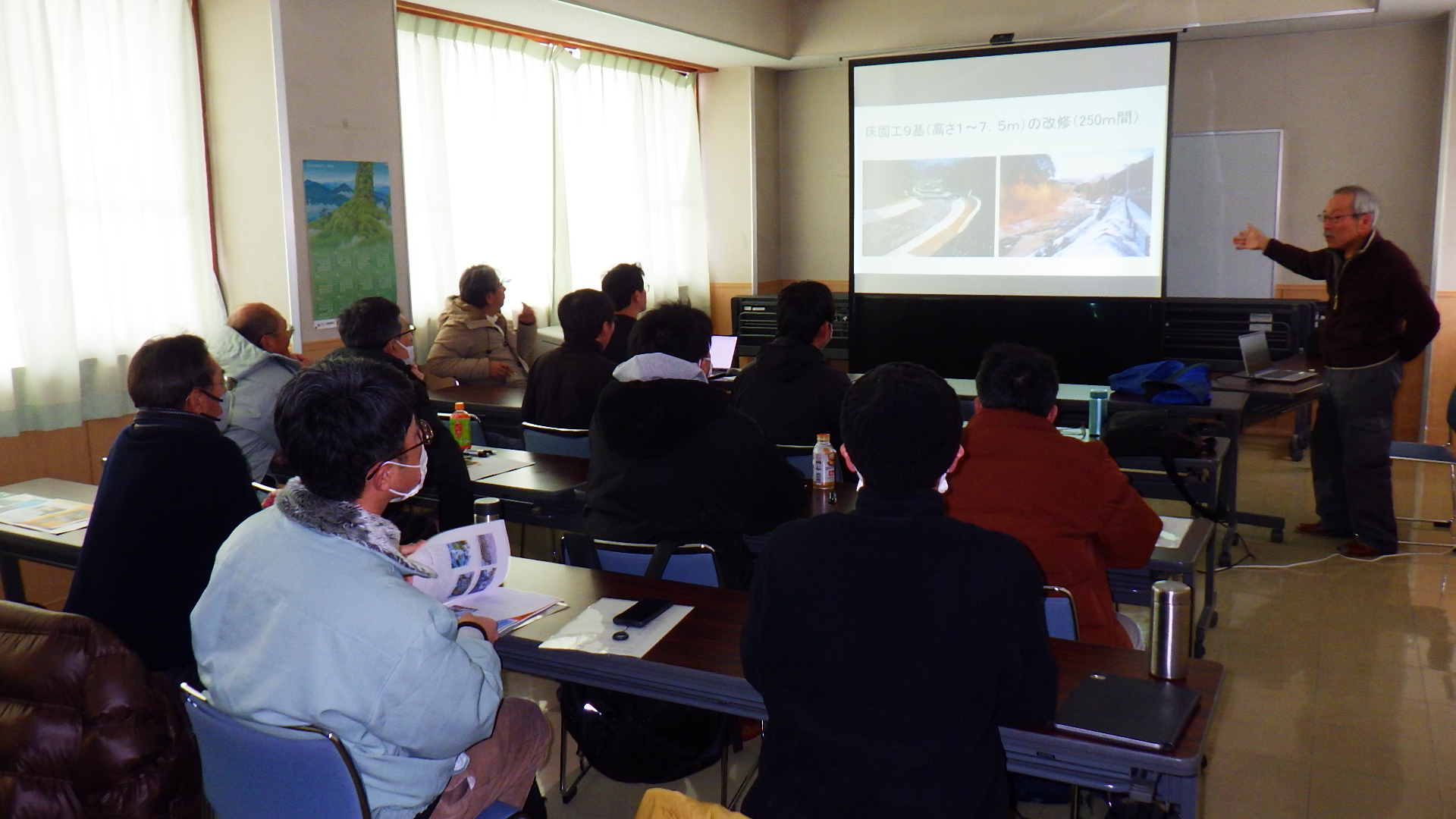 この改修に初めから関わった地元松本の田口康夫さんを講師に招き、先ずは公民館で工事前の写真や工事中の写真を見ながら、改修工事の必要性やその意義についての説明を受けます。