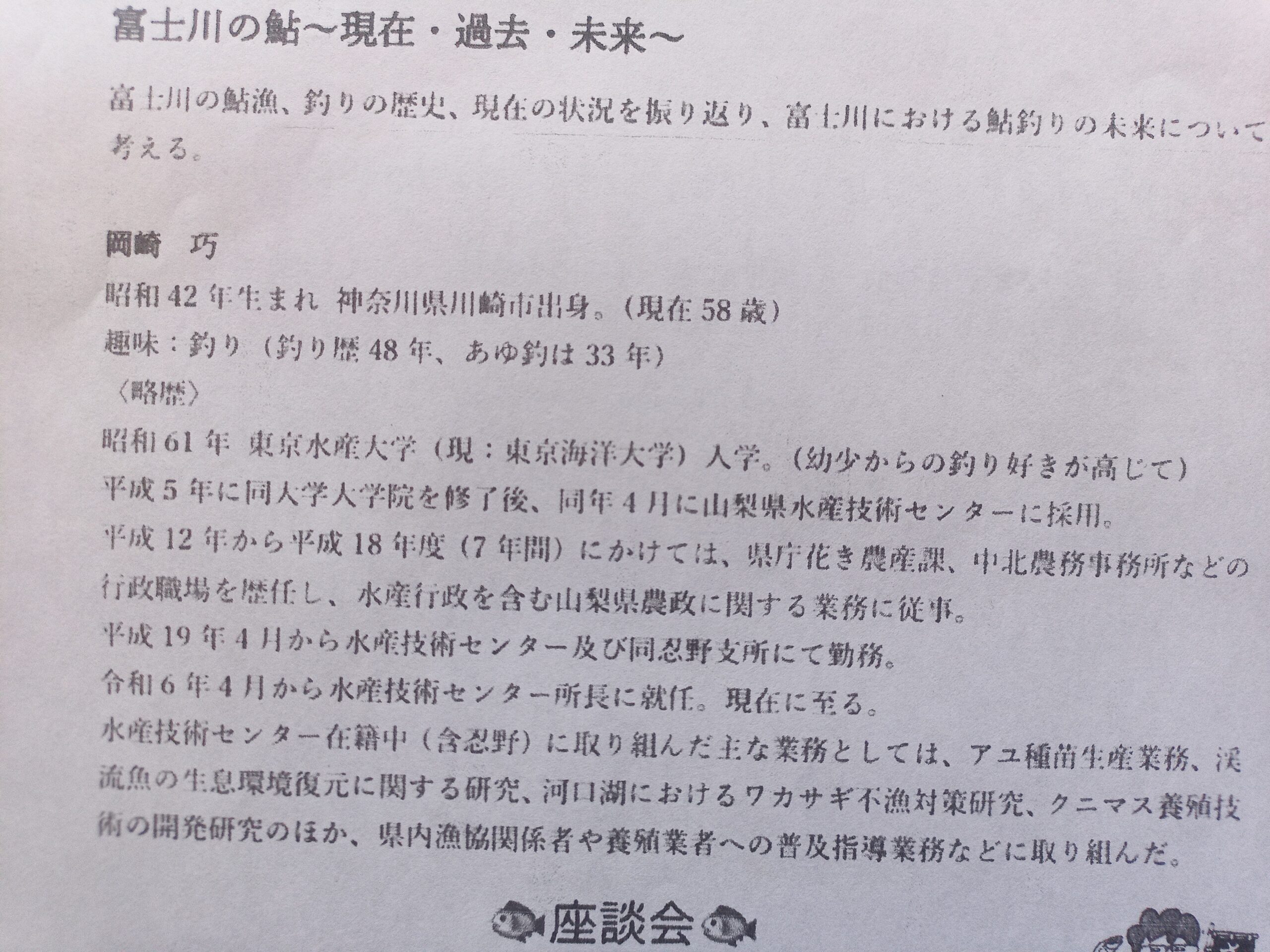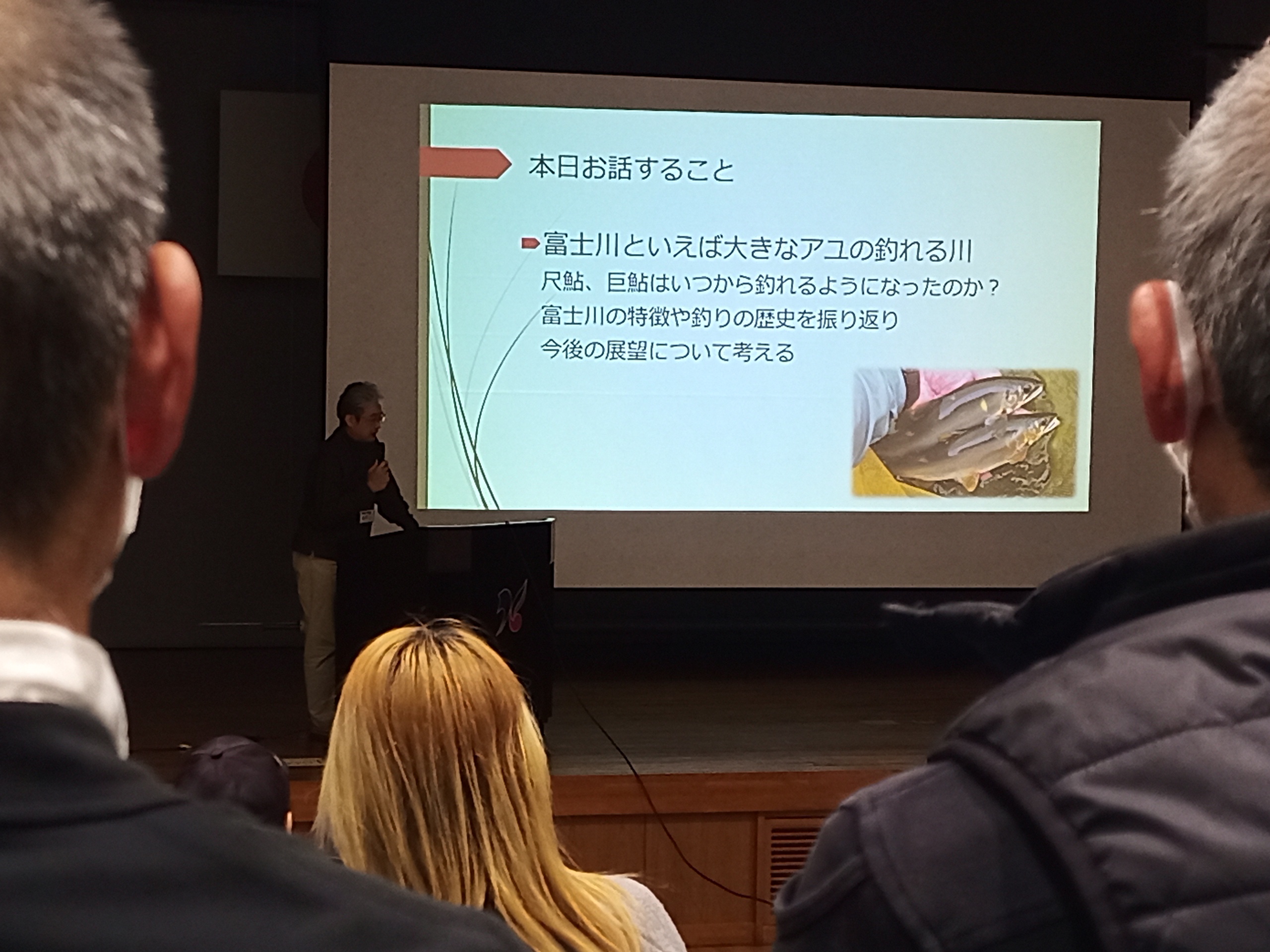 先ず初めの講演は、山梨県水産技術センター岡崎所長の「富士川の鮎~現在・過去・未来~」アユ釣りも好きなだけあって、話に熱がこもります。
