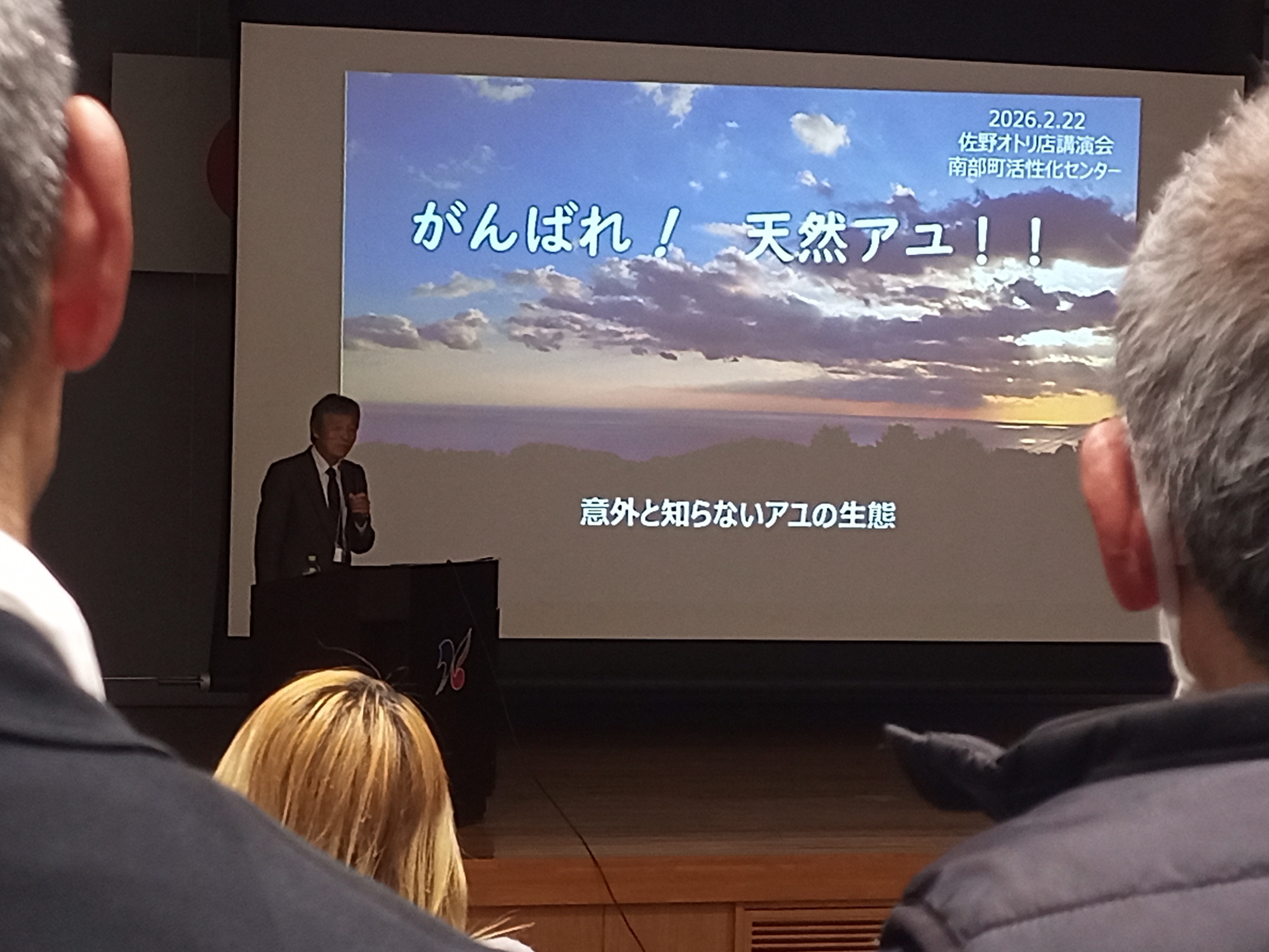 2月22日南部町にある活性化センターで「がんばれ 天然あゆ」と題した講演会と座談会が、佐野オトリ店の主催で開催されました。
